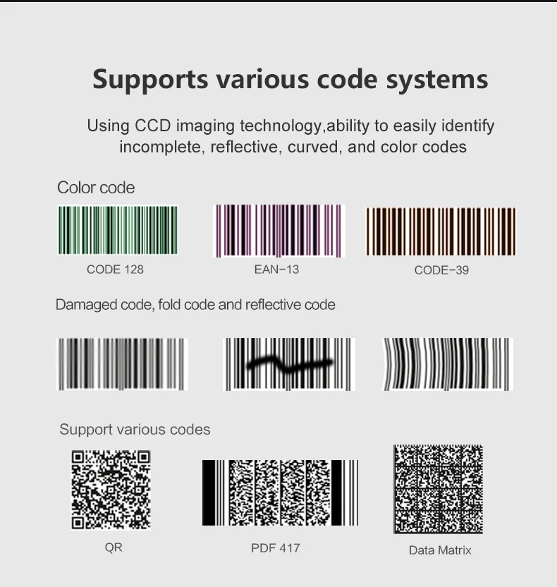 Identification | v1D: Code128,UCC/EAN-128,AIM128,EAN-8,EAN-13,ISBN/ISSN,UPC-E,UPC-A,Interleaved 2 of 5,ITF-6,ITF-4,Matrix 2 of 5,Industrial 2 of 5,Standard 2 of 5,Code39,Codabar,Code93,Code11,Plessey,MSI-Plessey,RSS-14,RSS-Limited,RSS-Expand 2D:QR ,PDF417 ,Data Matrix |